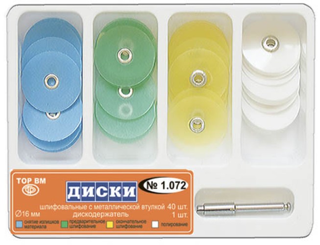 Универсальный комплект шлифовальных дисков 1.072 используется для обработки реставраций из пломбировочных композитов. Диаметр в 16 мм оптимален для обработки областей любого размера.